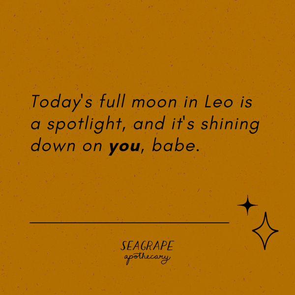 As you feel into tomorrow's Full Moon in Leo, you are being asked to let the lunation shine on your desire. This full moon in Leo is a spotlight, and it's shining down on you, babe. It's okay if your first instinct is to flinch away, to retreat to the darkness of the dark moon period and the safety of introspection—but this full moon isn't here to interrogate you. This Leo full moon is here to offer praise, support, and a healthy amount of discomfort.Â
